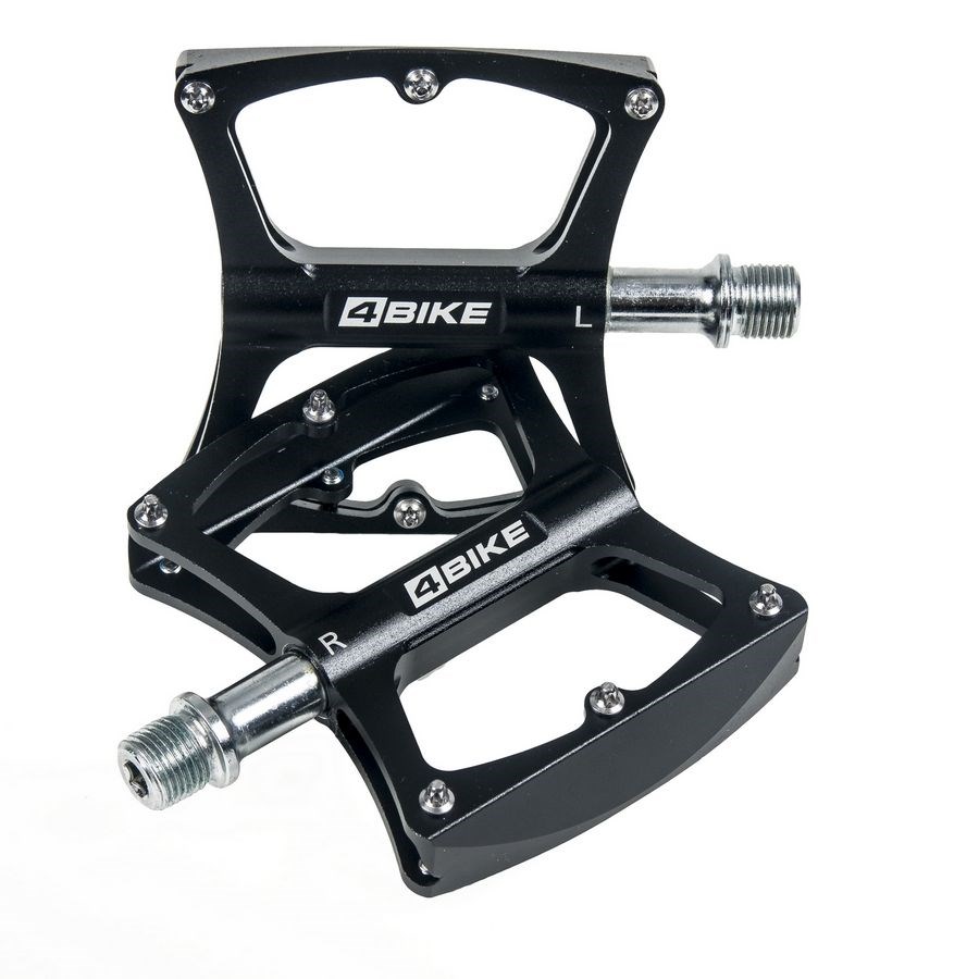 Педали 4BIKE K340 черные, материал CNC алюминий, размер платформы 104х98х18 мм, 2 промышленных подшипника, 1 втулка скольжения, ось Cr-mo, 12 сменных шипов на каждой педали, вес 312 грамм (пара).