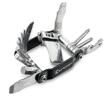 Компактный складной набор из двадцати инструментов от Birzman – для тех, кто хочет всегда иметь при себе всё самое необходимое. В набор входят выжимка для цепи, плоская и крестовая отвёртки, монтажка для покрышек, нож, открыватель для банок, спицевой ключ с пятью ячейками (3.2/3.4/4.3/4.4/Mavic), ключ Torx T25, а также шестигранные ключи размером от 2 до 8мм. Корпус выжимки и боковые панели набора изготовлены из алюминиевого сплава, остальные части – из стали марки 6150.