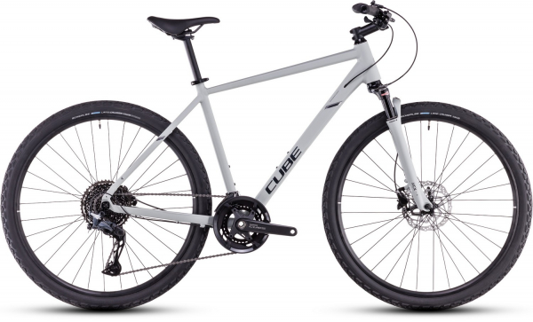 Дорожный велосипед гибридного типа с оборудованием профессионального класса Shimano, 11 скоростей. Технические особенности: алюминиевая рама Aluminium Superlite (двойной баттинг, гидроформинг, конический рулевой стакан, скрытая проводка рубашки переключателей), амортизационная вилка SR Suntour NCX E RL Air T (воздушная, ход 63 мм, выносная блокировка), двойные алюминиевые обода CUBE EX25 (подходят для бескамерного использования), дисковые гидравлические тормоза Shimano BR-MT200 (роторы 180/160 мм), защита цепи. Подходит для активной езды по шоссе и несложной пересеченной местности.
