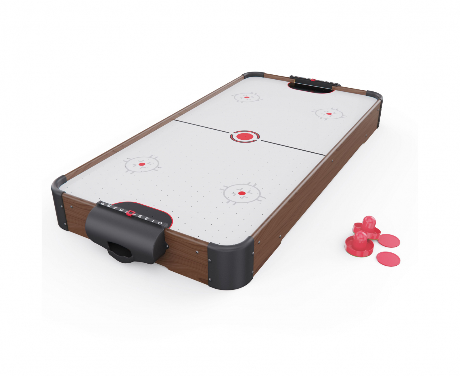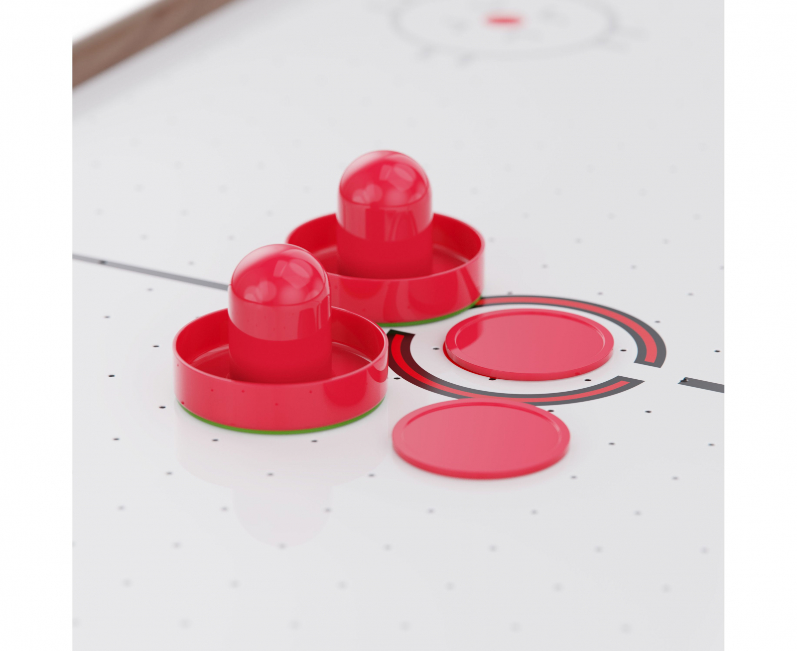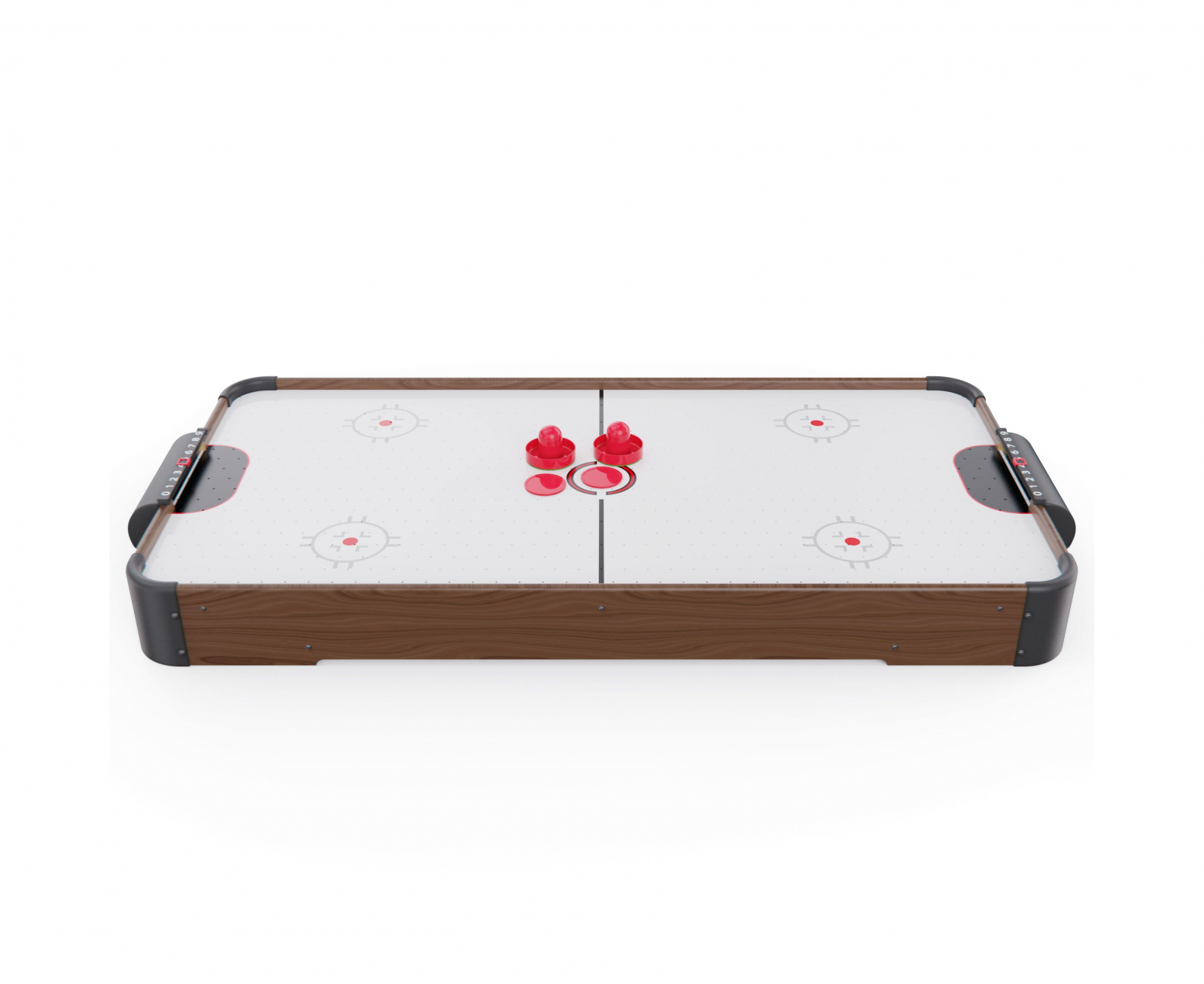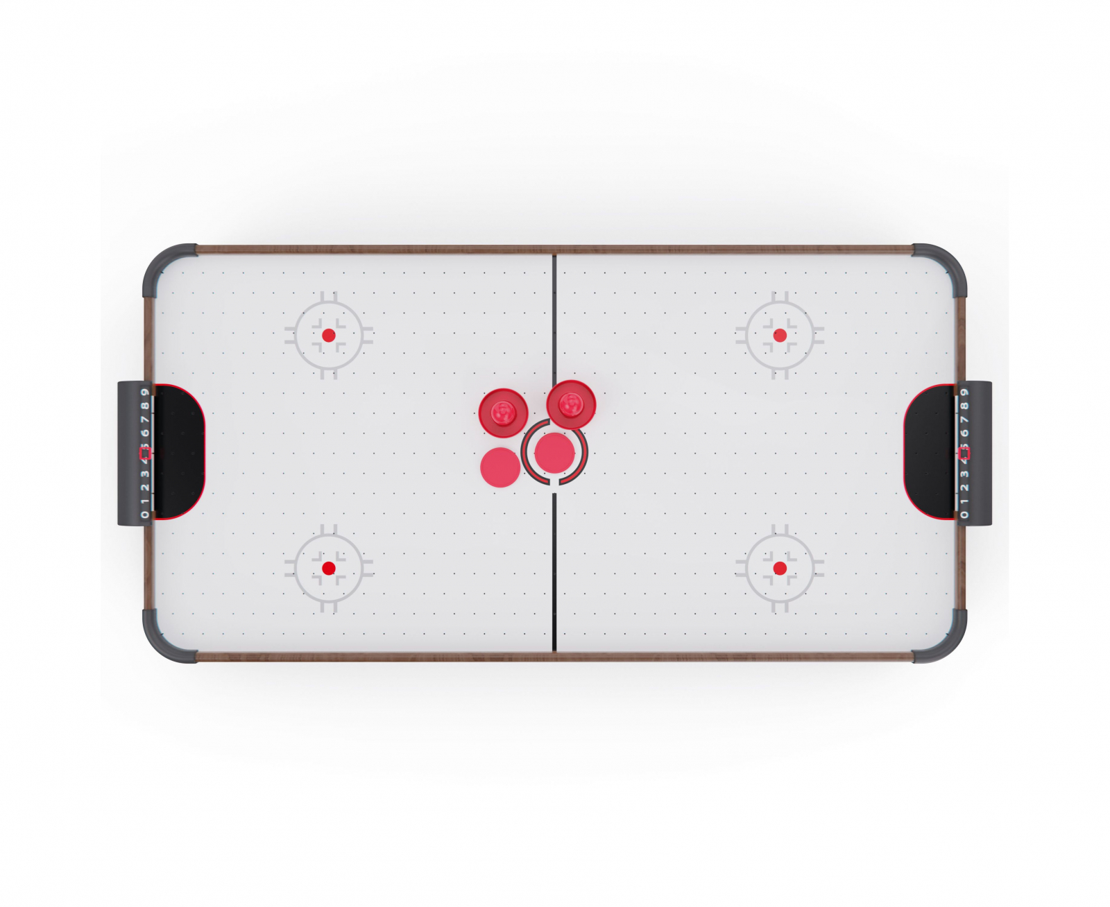 Игровой стол оснащён вентилятором на 220V, создающим воздушную подушку под шайбой. Это обеспечивает лёгкое и быстрое скольжение по полю, делая игру более захватывающей и реалистичной.