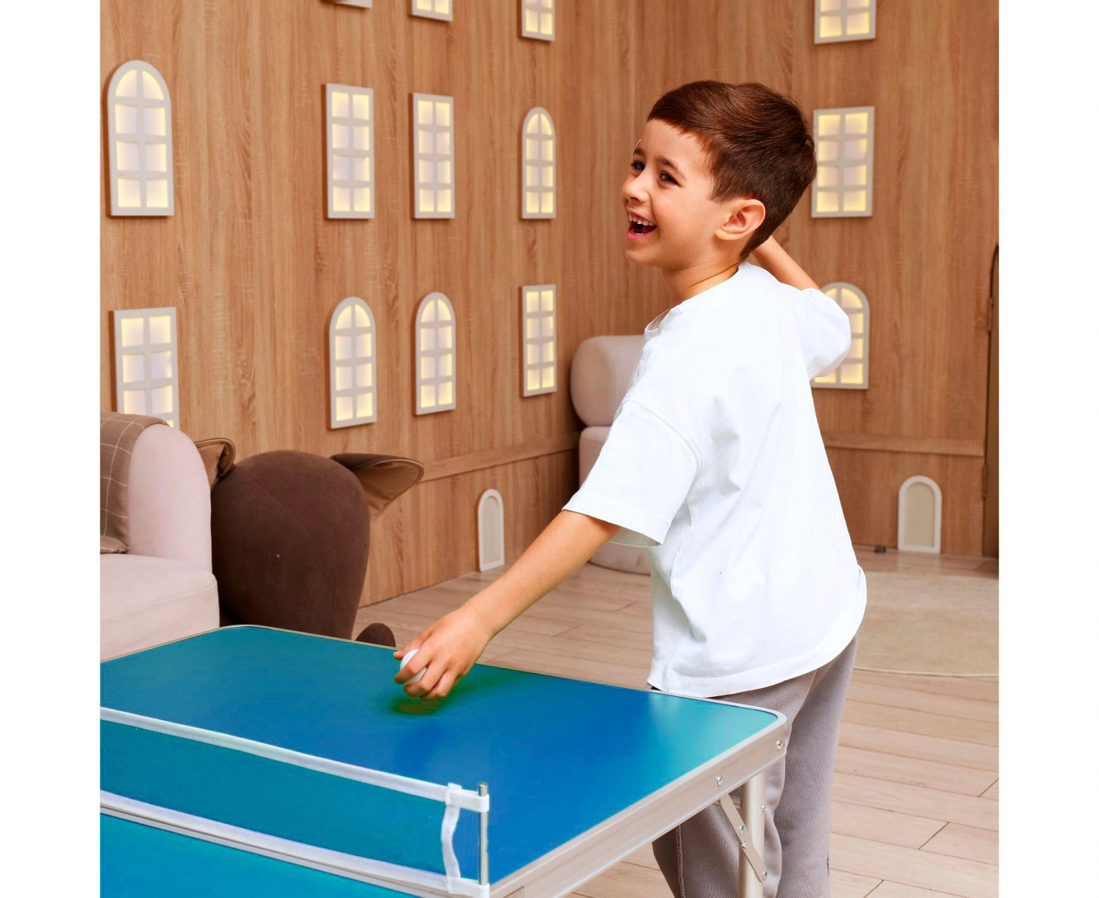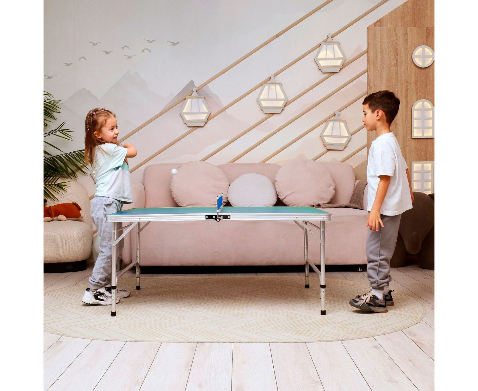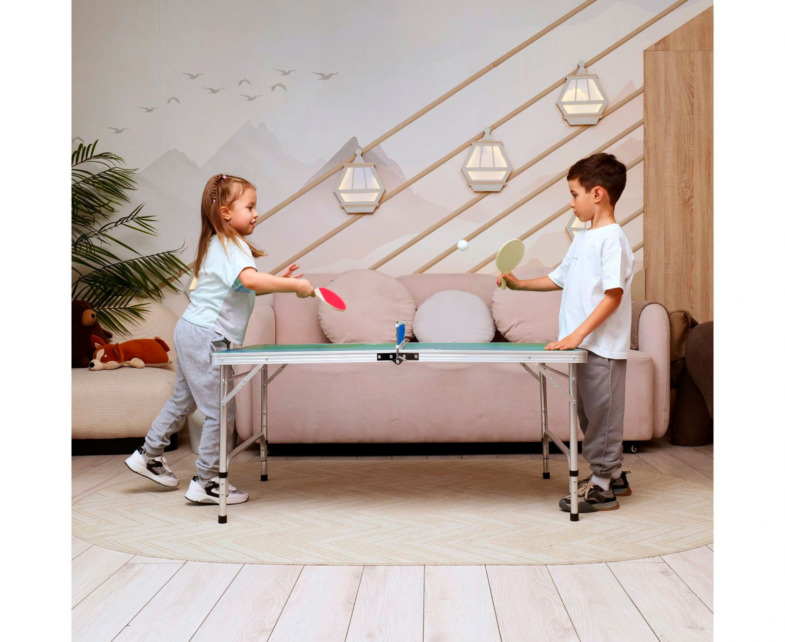 В комплект входят: сетка, 2 ракетки и 2 белых мячика диаметром 40 мм.