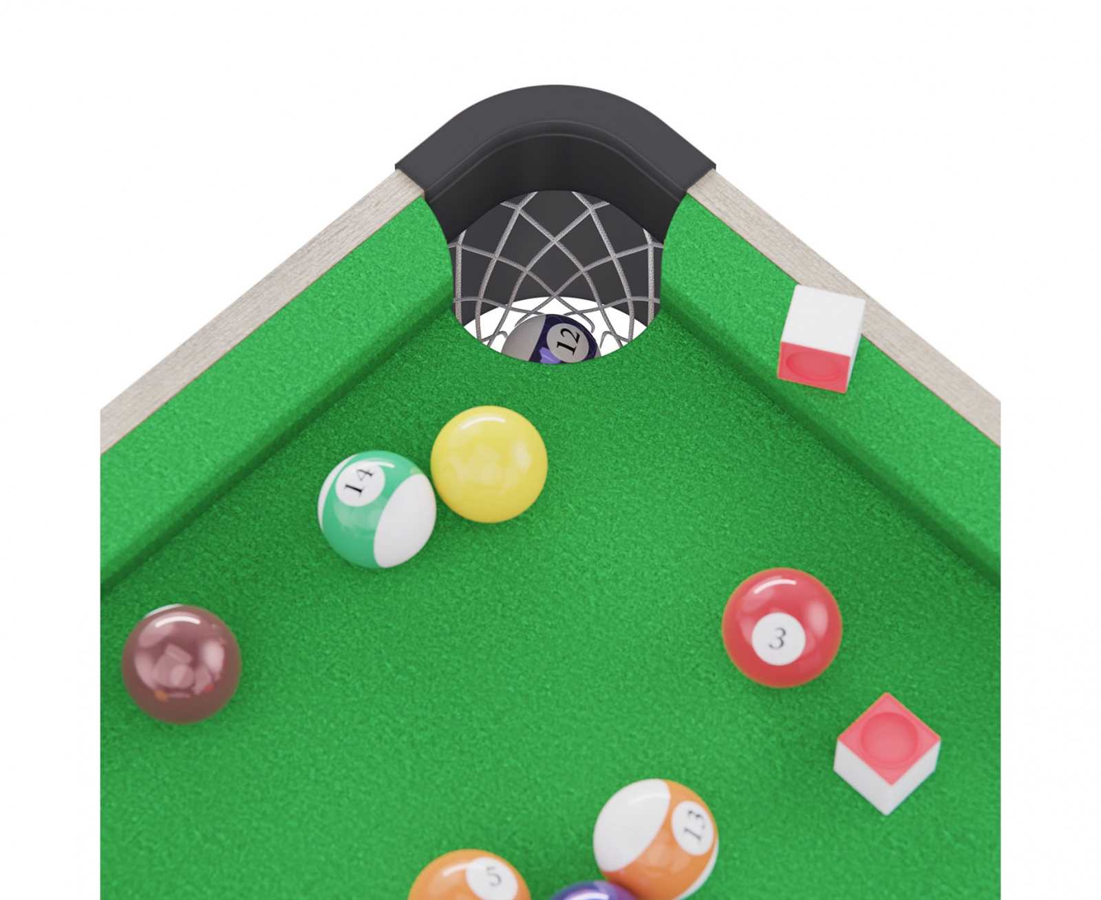 Диаметр шара — 38 мм, длина кия — 107 см, диаметр луз — 70 мм. Все элементы выполнены с точным соблюдением пропорций, что делает игру максимально приближенной к профессиональной.