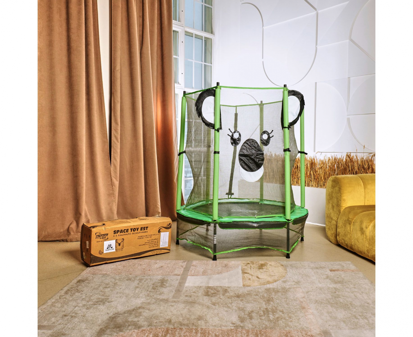 Внешняя защитная сетка высотой 126 см обеспечивает безопасность пользователей, предотвращая возможные выпады за пределы батута. Она легко открывается и закрывается с помощью специального замка и надежно фиксируется на стойках, выполненных из высокопрочной стали. Необычный дизайн сетки в виде коалы особенно порадует самых маленьких и требовательных прыгунов!
