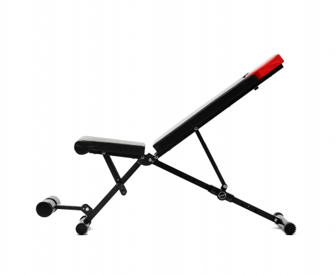 Функциональная и стильная скамья предназначена для домашнего использования. Имеет необычный дизайн: подголовник имеет ярко-красный цвет. Остальная конструкция выполнена в чёрном цвете. Такой дизайн подойдёт как для небольшого домашнего фитнес-зала, так и впишется в интерьер любой комнаты в доме или квартире.