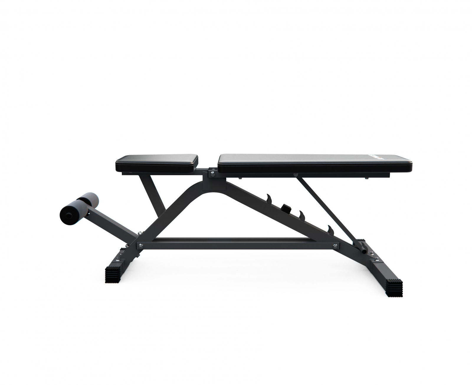 Спинка регулируется на 5 уровней от -20° до 90°. Разнообразие положений позволяет выполнять разные виды жима, прокачивать бицепсы и мышцы брюшной полости. Скамья дополнительно оснащена валиком для ног диаметром 7,5 см и длиной 13,2 см, регулируемым на 2 уровня с надежной фиксацией и креплением для гантелей.