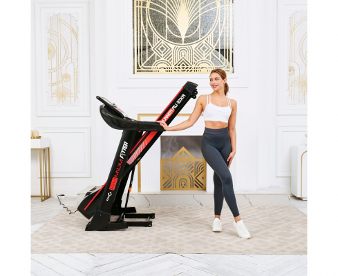 Складная конструкция позволяет легко хранить и перемещать тренажер. Гидроцилиндр обеспечивает быстрое и удобное складывание, в то время как раскладывание происходит с одного толчка. 5-дюймовый дисплей предоставляет информацию о текущей программе, продолжительности тренировки, пройденной дистанции, сожженных калориях (оценка), частоте пульса, наклоне и программах.