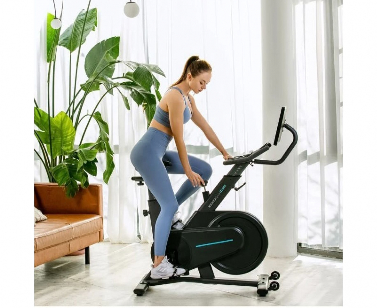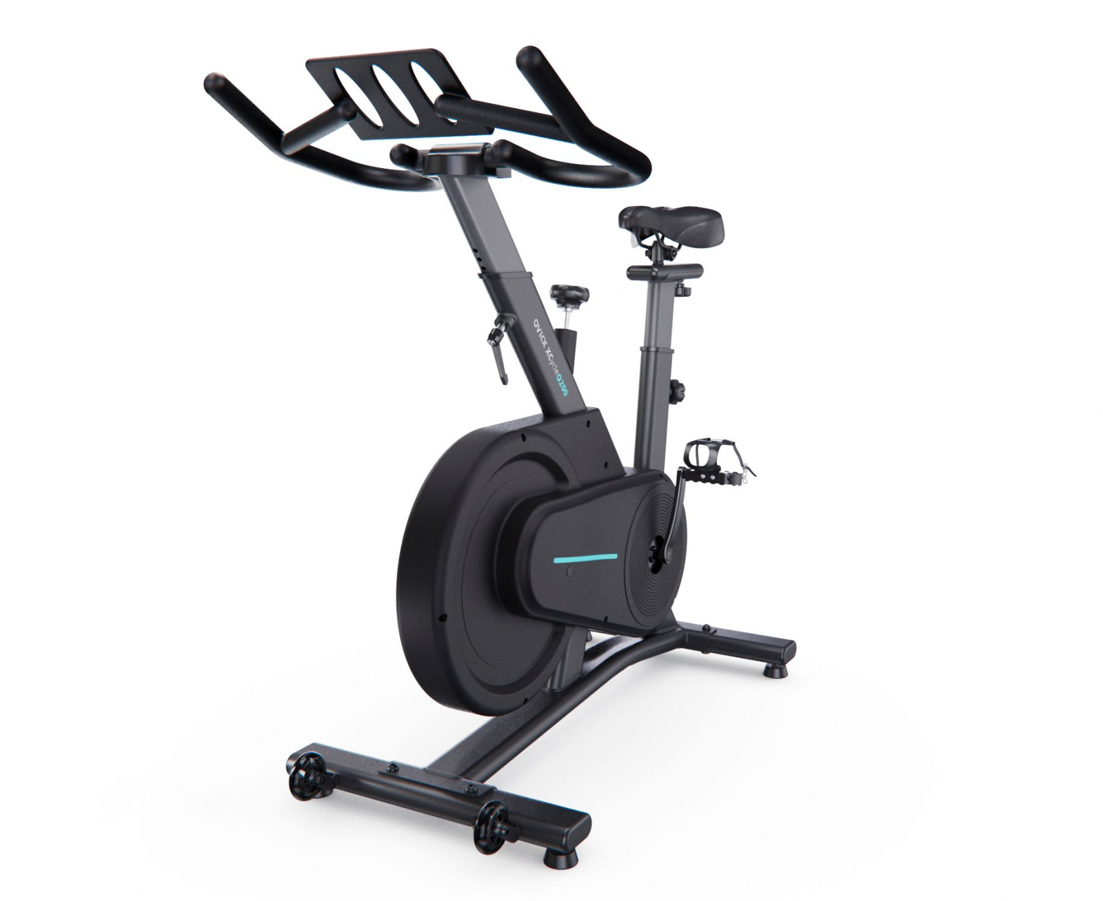 Маховик массой 15 килограмм обеспечивает плавный ход и регулировку интенсивности нагрузки. Возможность крутить педали в обе стороны добавляет разнообразия в тренировочный процесс. Ремень, обернутый вокруг маховика, обеспечивает уровень шума не более 52 дБ, делая спин-байк идеальным вариантом для домашнего использования.