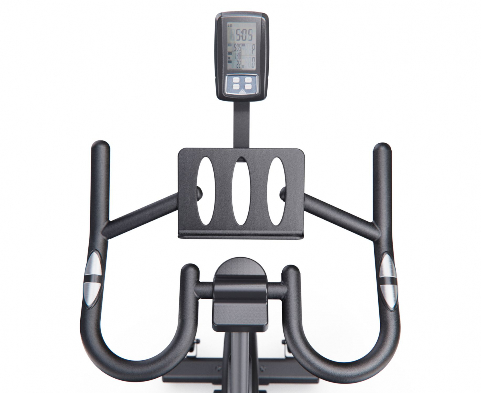 Монохромный дисплей отображает такие параметры как время, скорость, дистанция, калории, количество оборотов в минуту и пульс. Есть целевой режим и режим восстановления.