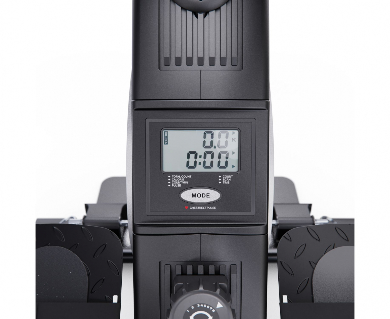 Монохромный LCD-дисплей отображает основные параметры тренировки, такие как время, количество гребков, общее количество гребков и калории, а также имеет режим сканирования. Размер консоли 10,5 х 11 х 3 см.