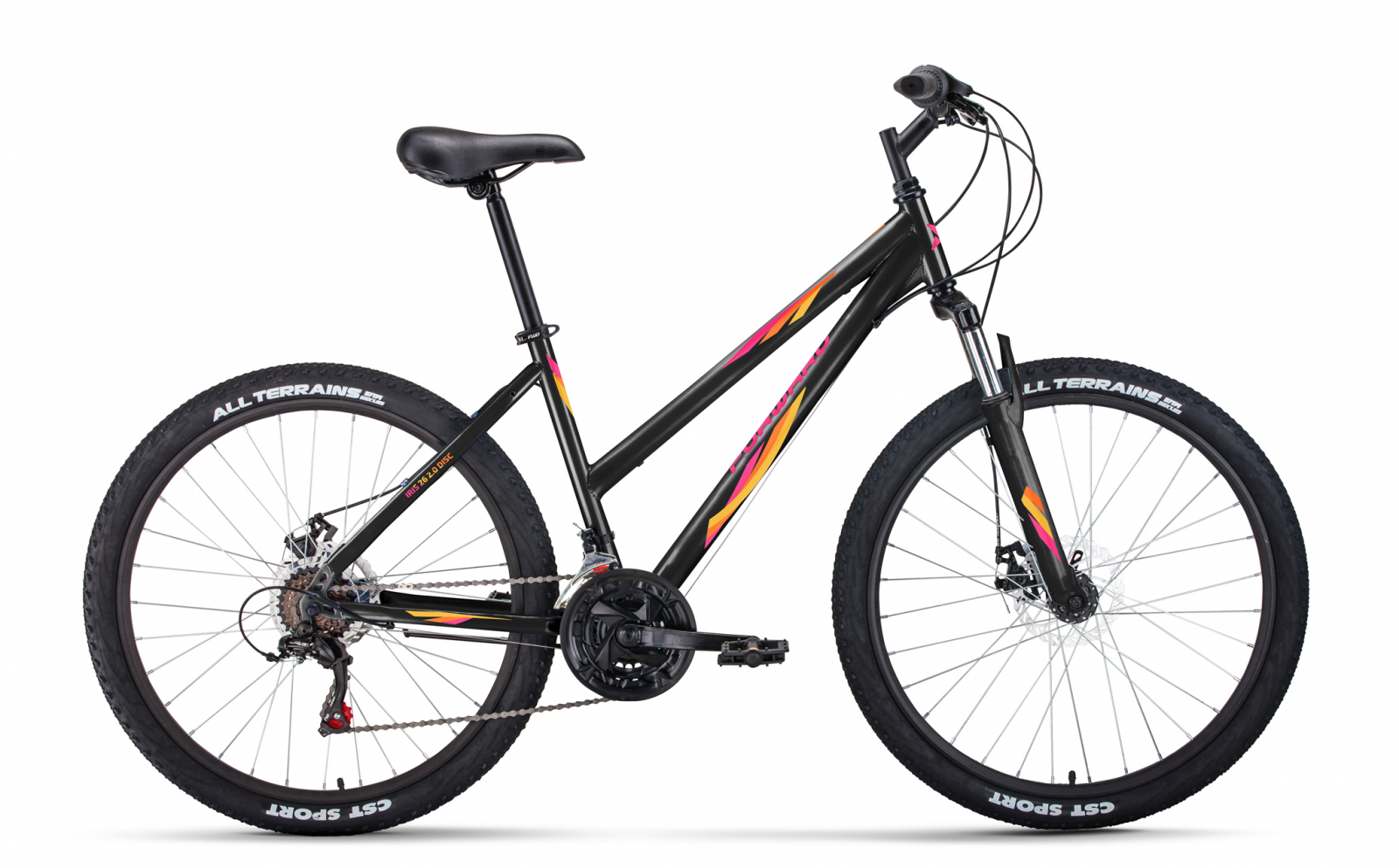 Женский спортивный велосипед с навесным оборудованием Shimano, 18 скоростей. Технические особенности: стальная рама Hi-Ten, амортизационная вилка FWD 158S с ходом 50 мм, двойные алюминиевые обода, дисковые механические тормоза Clarks CMD-21. Подходит для прогулочной езды по различным дорогам и пересеченной местности.