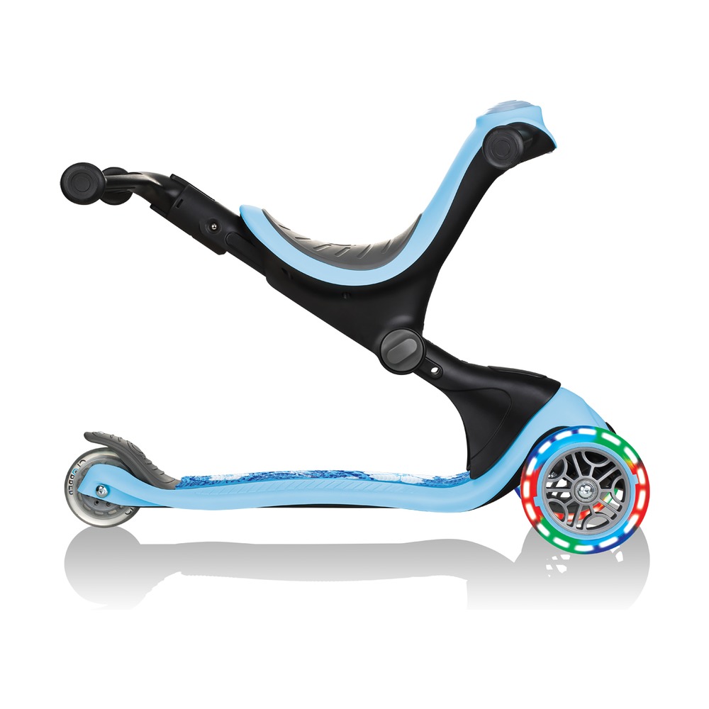 Globber Go Up Deluxe Fantasy Lights — это трансформер 3 в 1: самокат, беговел и каталка. Самокат оснащен удобным и широким сидением с регулировкой по высоте. Модель легко трансформируется и складывается без инструментов, с помощью запатентованной системы со специальной кнопкой. Рулевая стойка Т-образной формы имеет 4 режима высоты. Передние колеса с подсветкой мигают красным, синим и зеленым цветами.