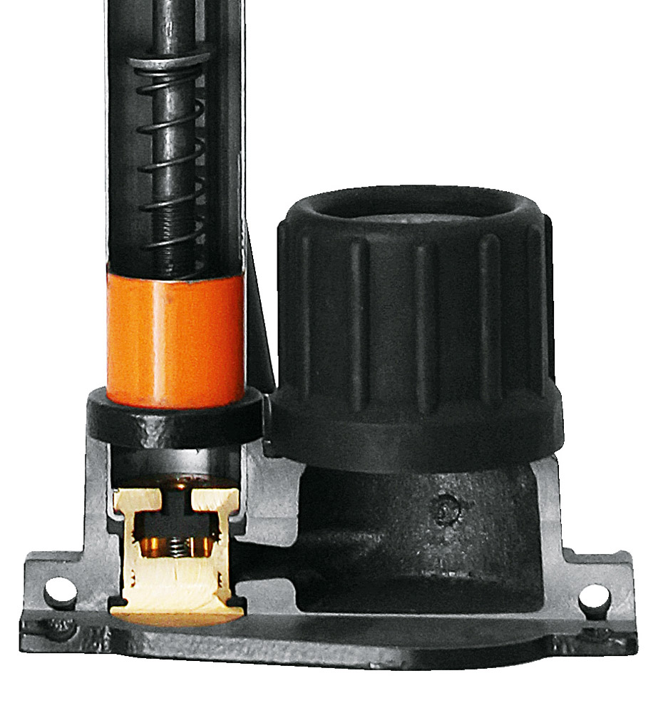 Цельная металлическая труба, чугунное основание, прецизионный манометр, а также черная деревянная ручка демонстрируют высочайшее качество. Ножки складываются, что облегчает транспортировку. Напольный насос поставляется в оригинальном исполнении SKS Orange и нагнетает давление до 16 бар / 230 фунтов на квадратный дюйм в велосипедные шины.