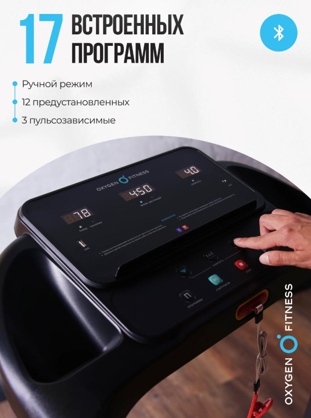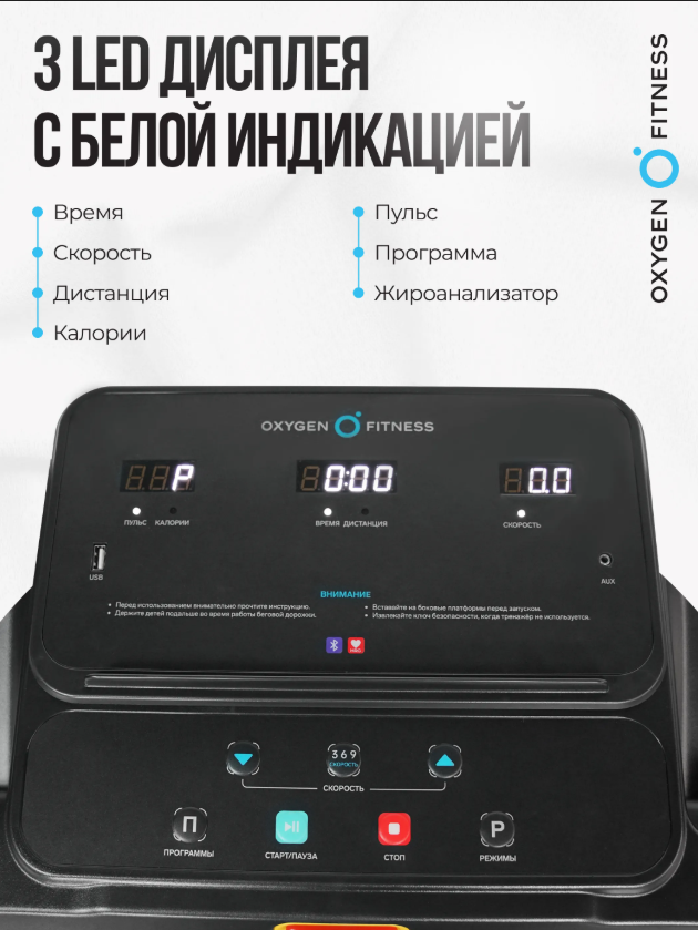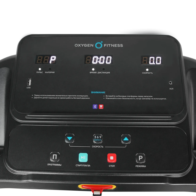 Консоль OXYGEN FITNESS NIOBI оборудована тремя LED-дисплеями с белой индикацией, на которых отображаются важные параметры: время, скорость, дистанция, калории, пульс и программы. Дорожка предлагает 17 различных программ, включая ручной режим, 12 предустановленных и 3 пульсозависимые, что позволяет каждому подобрать оптимальный вариант для тренировок. Интуитивно понятный интерфейс на русском и английском языках делает использование тренажера простым и удобным.