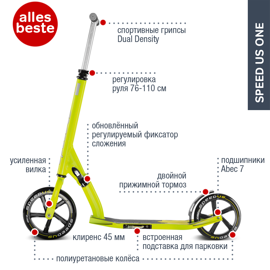 Городской самокат Puky Speed Us (Speed for all of us) - концепт от немецкого бренда для всей семьи! Детям от 4,5 лет понравится его быстрый ход и потрясающая управляемость. Самокат из алюминия, поэтому весит совсем немного. Мамы будут в восторге от ограничения поворота руля - такой самокат не оставит синяков на щиколотках и будет долго катиться по ровной дороге.Папы оценят настоящую немецкую прочность и приличную скорость. Благодаря большим колесам и подшипникам высшего класса Abec7 накат у самоката отличный.