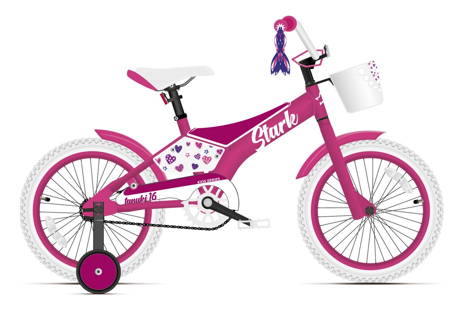 Велосипед, предназначенный для девочек в возрасте от трех до шести лет, без переключения передач. Технические особенности: алюминиевая рама AL-6061, жесткая вилка Stark Rigid, одинарные алюминиевые обода, ножные педальные тормоза, защита цепи, съемные боковые колеса, мягкая накладка на руле, передняя корзинка, звонок. Подходит для обучения и легких прогулок.