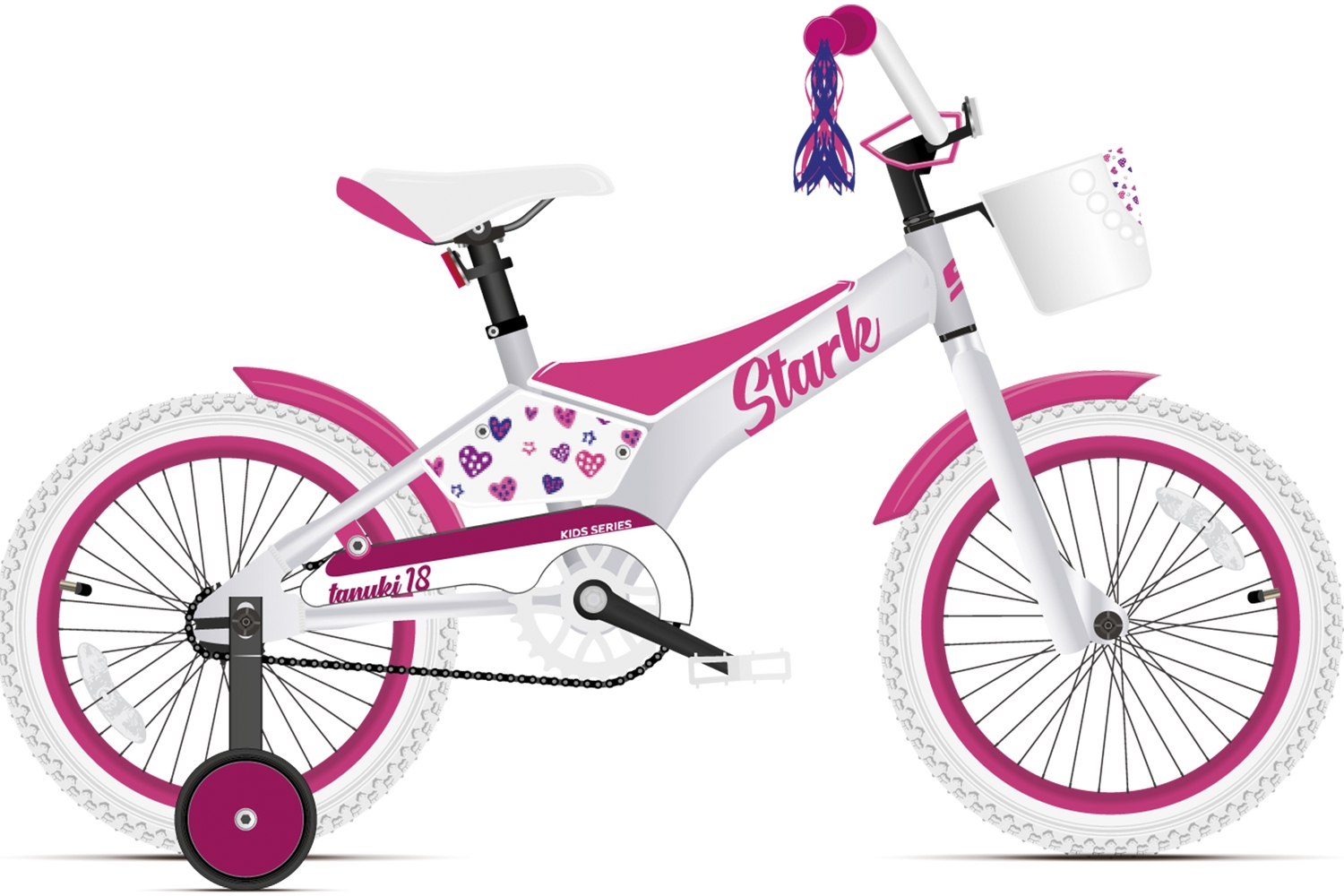 Велосипед, предназначенный для девочек в возрасте от четырех до восьми лет, без переключения передач. Технические особенности: алюминиевая рама AL-6061, жесткая вилка Stark Rigid, одинарные алюминиевые обода, ножные педальные тормоза, защита цепи, съемные боковые колеса, мягкая накладка на руле, передняя корзинка, звонок. Подходит для обучения и легких прогулок.