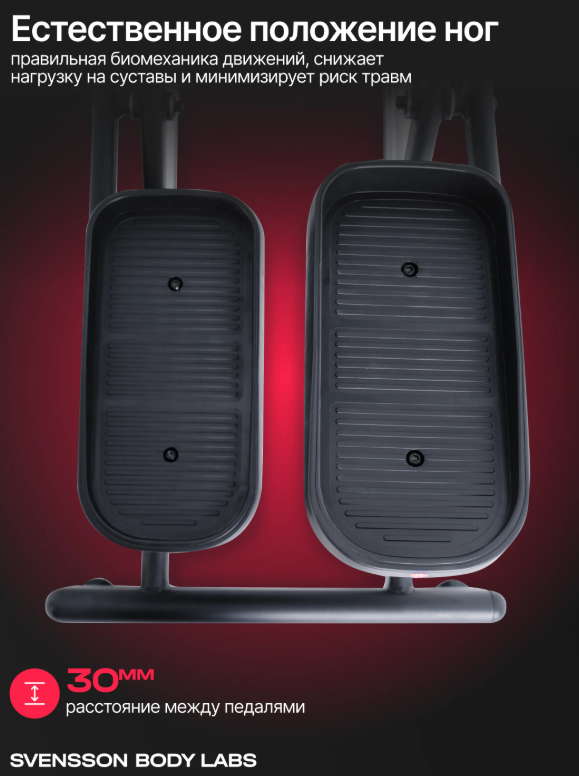 Тренажер предлагает инерционный вес маховика в 24 кг, что обеспечивает плавный и комфортный ход. Расстояние между педалями составляет всего 30 мм, что способствует естественному движению во время тренировки. Длина шага в 500 мм и антискользящие педали увеличенного размера гарантируют безопасные и эффективные занятия. Двухпозиционные нескользящие рукоятки с сенсорными датчиками пульса позволяют контролировать сердечный ритм во время тренировки.
