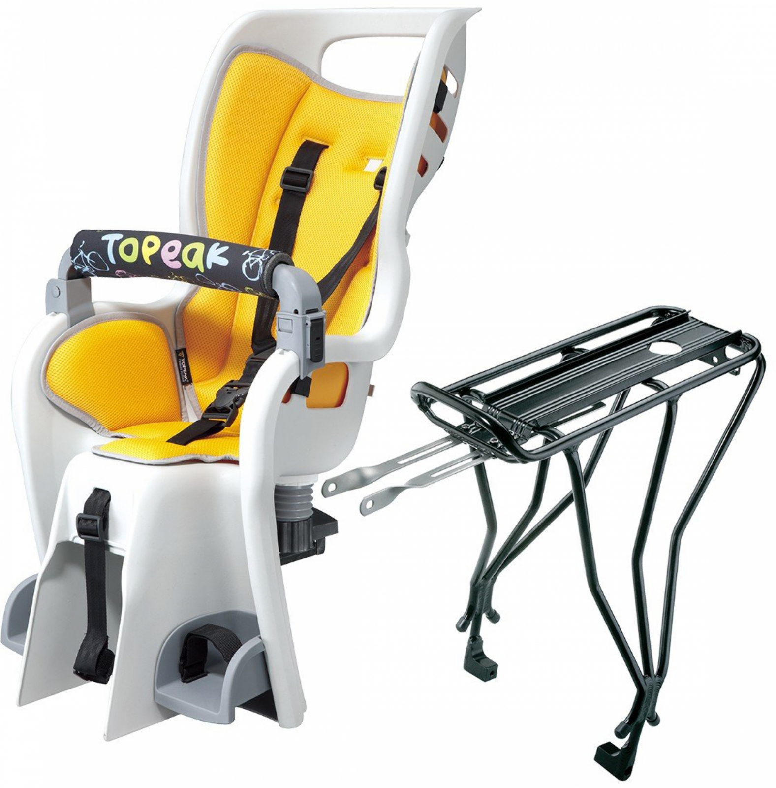 Уникальное высокотехнологичное безопасное велокресло в комплекте с багажником для велосипедов с размером колеса 26 дюймов и обычными (не дисковыми) тормозами. Багажник совместим с сумками серии MTX QuickTrack.Закрытая с обеих сторон конструкция сиденья, создает, как бы кокон, поэтому плечи ребёнка остаются защищенными. Плечевые ремни имеют регулировку под рост ребёнка, а трёхточечный замок, не даст ребёнку расстегнуться самостоятельно. Инновационная система подвески (два амортизатора) смягчает толчки и удары при движении, а интегрированная защитная дуга дополнительно защищает голову, и ещё может использоваться, как ручка для переноски. Подножки регулируются, а ремни для фиксации не дадут ногам ребенка попасть во вращающееся колесо. Ребёнок во время поездки может держаться за мягкую перекладину перед собой, которая так же откидывается для удобного изъятия ребёнка из кресла. Мягкую сидушку (жёлтого цвета) можно снять для стирки. На оборотной стороне кресла есть катафот для безопасности при движении.Детское сиденье соответствует самым строгим стандартам безопасности ЕС, CPSIA и Proposition 65. Имеющийся в комплекте багажник повышенной прочности под дисковые тормоза, снабжен инновационным креплением BabySeat II, для которого не требуются ни какой инструменты при установке и снятии сиденья с багажника. Если снять сиденье, на багажнике есть система QuickTrack которая совместима с многими аксессуарами серий TOPEAK (к примеру можно установить сумку, кофр, ящик и т.д.) Материалы: кресло из инженерного пластика, багажник из прочного 6061 T-6 алюминия.Максимальная грузоподъемность: Кресло - 22 кг. Багажник - 25 кг. соответствует EN 14872 / ISO 11243.Размеры: Кресло - 77,4 x 58,5 x 39,5 см. Багажник - 40 x 34 x 17 см.