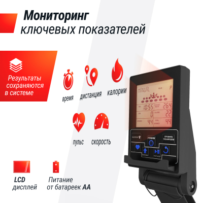 Тренажер для гребли с ЖК дисплеем отслеживает такие результаты как: время, дистанция, количество сожжённых калорий, скорости, количества оборотов, WATT и вести контроль за частотой сердцебиения. Это позволяет контролировать показатели тренировки и мотивировать себя на новые победы!