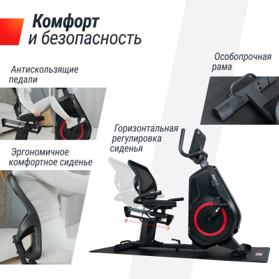 Особопрочная горизонтальная конструкция тренажера велосипеда обеспечивает оптимальное распределение нагрузки на тело, что особенно важно для людей с проблемами спины или суставов. Удобное сиденье с анатомической формой и горизонтальной регулируемой высотой позволяет вам наслаждаться тренировками без дискомфорта. Специальные упоры для рук обеспечивают дополнительную поддержку, а антискользящие педали предотвратят соскальзывание ног, позволяя вам сосредоточиться на своих целях. Подставка под планшет или телефон обеспечит дополнительный комфорт во время тренировки.