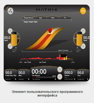 профиль динамический/статический, время, дистанция, скорость, обороты в мин., уровни, калории, калории в час, пульс, метаболические ед-цы, Ватты