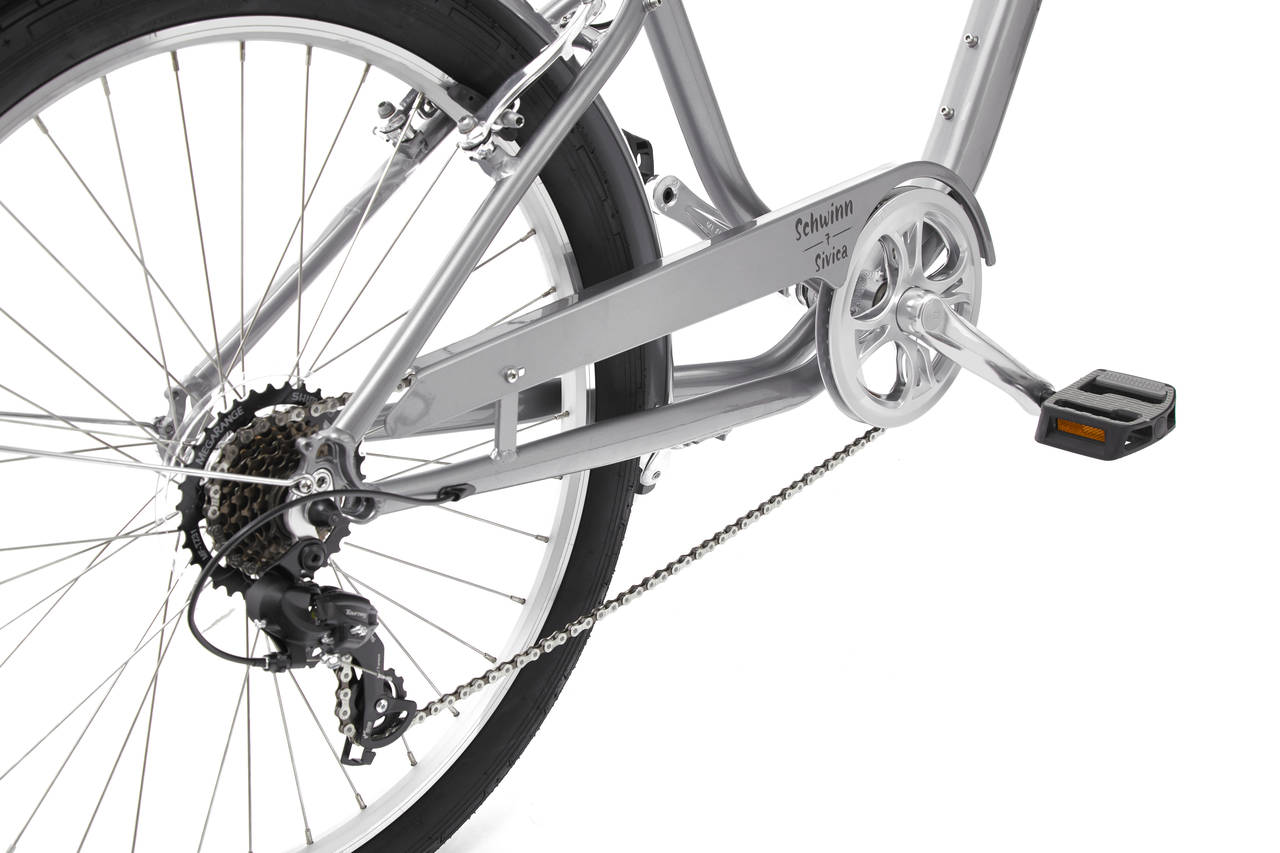 Sivica 7 - это комфортный семискоростной велосипед с неповторимым стилем. Увеличенная колёсная база и вынесенная вперёд каретка новой рамы Schwinn Relaxed Position Plus создаёт очень комфортную посадку и дарит стабильность при катании на небольших скоростях. Широкое комфортное седло, регулируемое по наклону, и регулируемый по высоте руль помогают подобрать посадку индивидуально для Вас. Семи скоростная трансмиссия Shimano Tourney управляется переключателями типа Грипшифт на руле, плавно и чётко меняет передачи и не требует частого обслуживания. Полноразмерные крылья и защита цепи предохраняют одежду от загрязнения и позволяют кататься в любую погоду. Входящая в комплект велосипеда подножка позволяет удобно парковать велосипед во время хранения или непродолжительной стоянки.